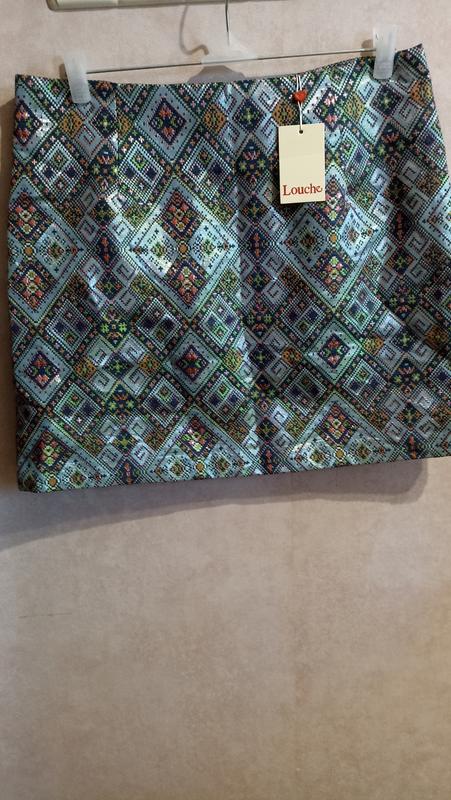 Новая, парчевая мини юбочка на подкладке. Застегивается сзади на молнию, без пояса. Очень удачное сочетание цветов. Ткань плотная, не растягивается. Длина -45см, пот-44см, пост-54см.