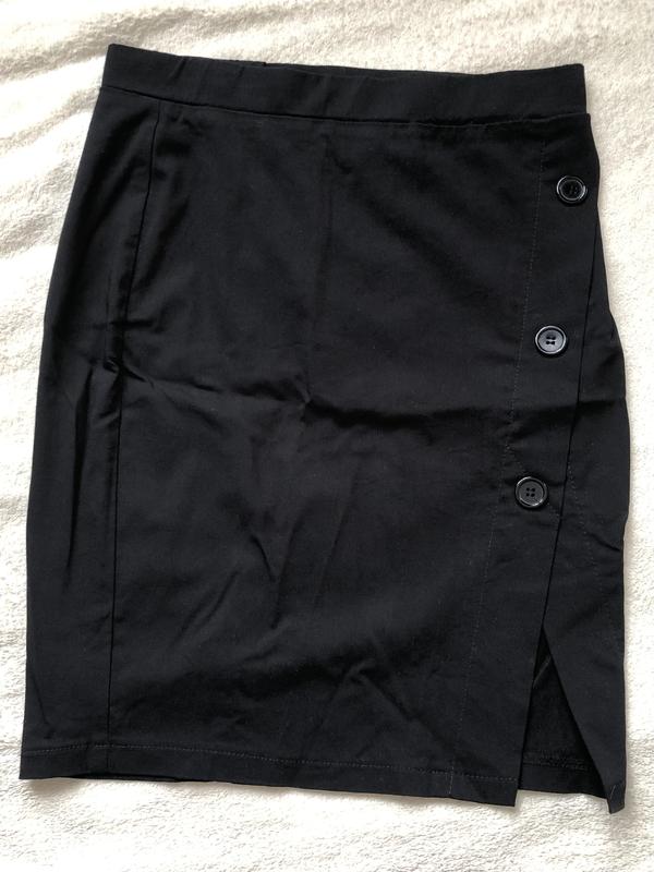 Спідниця з тканини типу костюмної, але трохи стрейчева. Гудзики для краси і маленький розріз на нозі. Не надягалася ні разу. Потребує прасування, тк не використовувалася. Заміри на фото. Колір чорний.