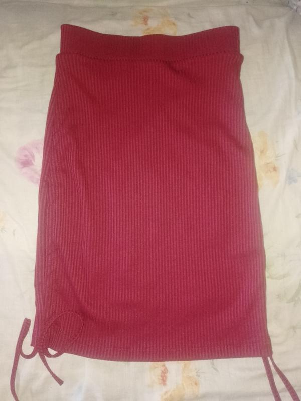 спідниця еластична на затяжках, бардового кольору, розмір 42-44, талія-31 см, дещо тягнеться, бедра 36, добре тягнеться, довжина 53 см, затягнути можна і на коротшу довжину