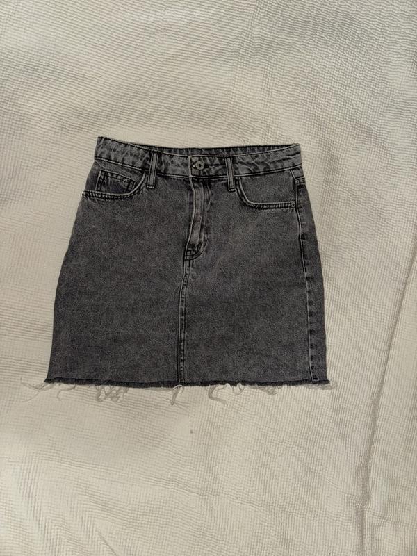 Джинсовая юбка серого цвета, в размере S-M, подойдет для девочки средней комплекции, есть карманы по бокам и сзади, юбка мини на высокой посадке