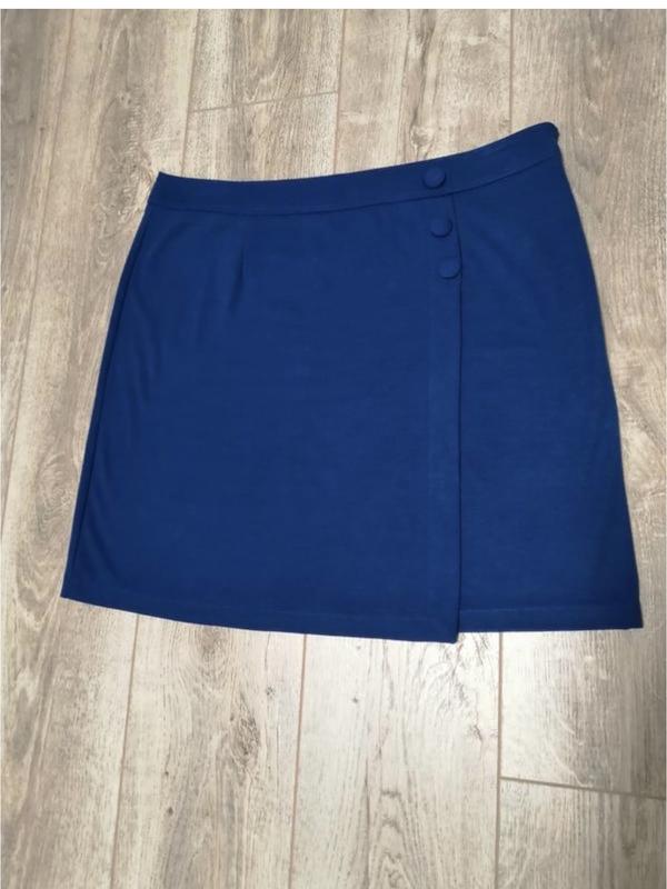 Жіноча синя міні спідниця від Liberty Island, розміром XXL. Матеріал поліестр, віскоза, еластан. З переду імітація ніби на запах, з трьома синіми гудзиками. З боку застібка блискавка.