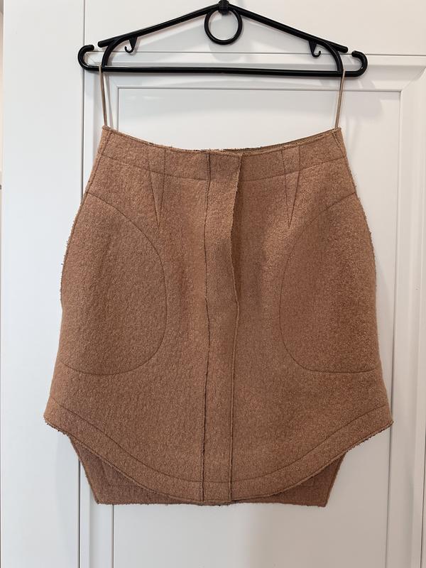 Юбка впереди укороченная, сзади длиннее, по бокам накладные кошечки, очень стильная. На высокой посадке. Материал шерсть, теплая. Размер 38, состояние новой, не носилось!! Застегивается на молнию и кнопку.
