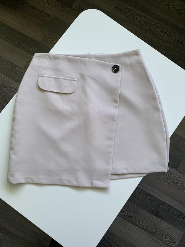 Спідниця бежевого кольору, з імітацією «запаху» Розмір 38 М У складі 15% віскоза, 83% поліестер Довжина 43 см, напівобхват талії 37 см, напівобхват стегон 50 см Стан ідеал