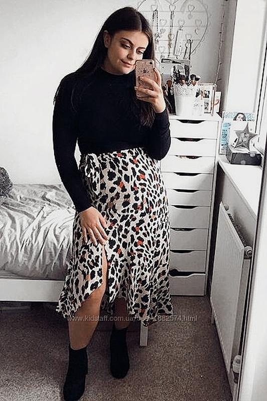 Трендова асиметрична леопардова спідниця в ідеальному стані. Спереду на нозі йде розріз, талія регулюється зав'язками та блискавкою. Розмір 22, заміри за запитом.
