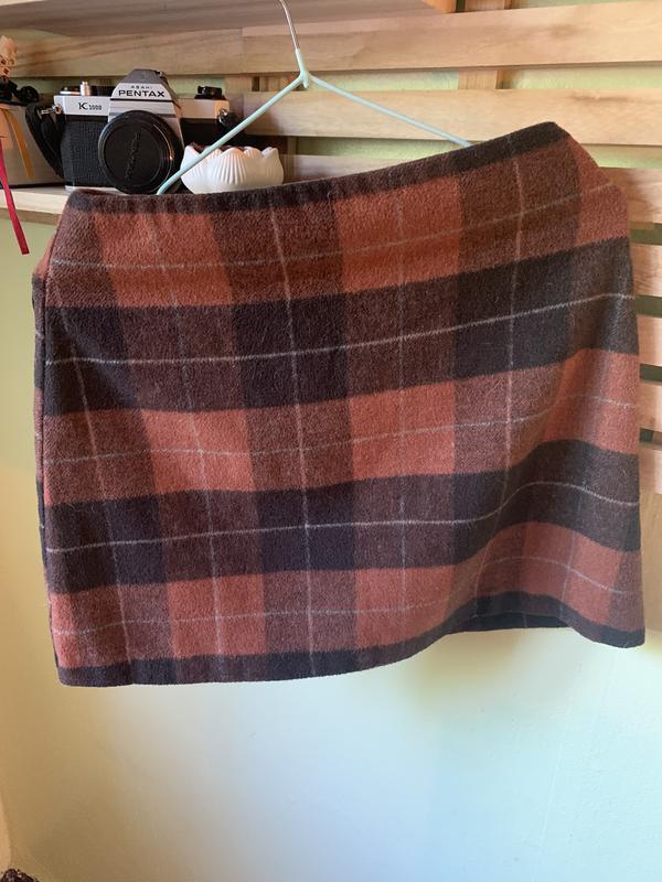 Коричнева, м’яка спідничка у клітинку. Позаду має блискавку