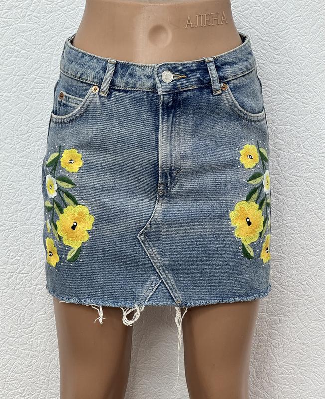 Блакитна джинсова міні-спідниця з необробленим краєм, боковою вишивкою квітів і декоративним косим швом спереду. На попі кармани .