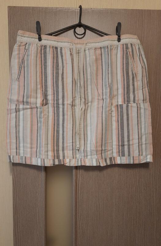Короткая юбка из натурального материала: 55% лен, 45% коттон. Свободный крой. Она имеет закрытую резинку на талии со шнурком. Без подкладки. Замеры: пот 48-58 (резинка) пос 65 длина 50 #3
