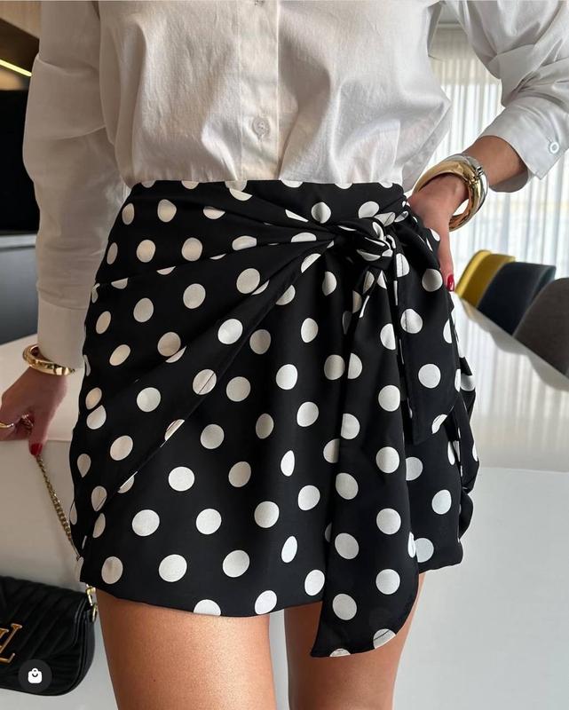 Спідниця з трендовими завʼязками 💥 Мод #284 Тканина : софт Розміри :42-44;44-46 Кольора : чорний , мокко -однотон Чорний фон білий горох, молочний фон тигр, бежевий фон тигр -принти Спідниця з завʼязками в трендовий принтах та кольорах цього сезону 🫶🏻 Позаду на поясі йде на резиночці 🫶🏻