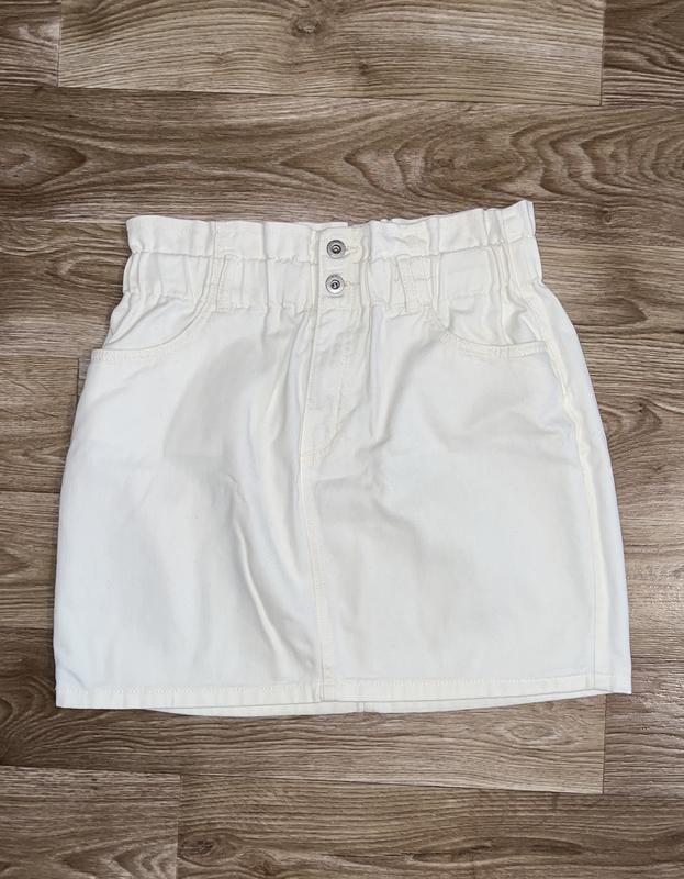 Джинсова спідниця молочного кольору, розмір Л, з резинкою на поясі Тканина легка, злегка тягнеться Заміри на фото