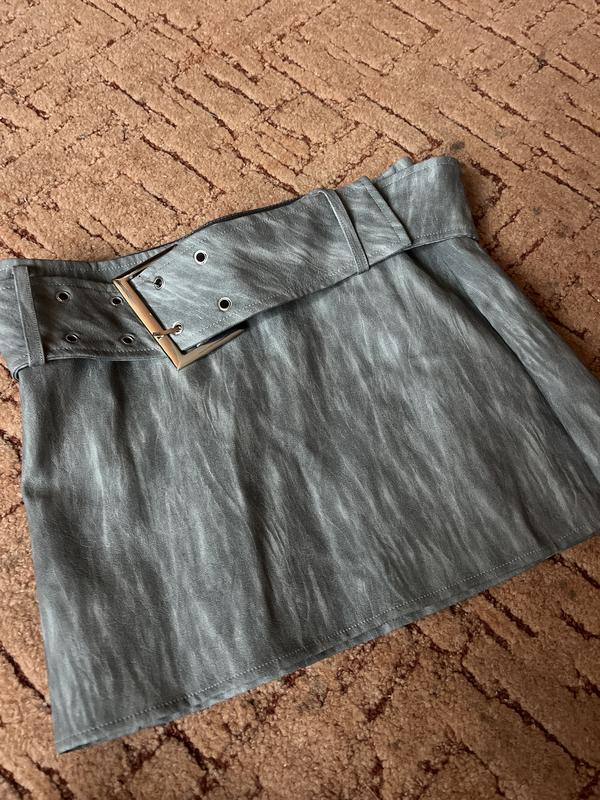 Стильна міні-спідниця з ефектом шкіри Продаю модну спідницю сірого кольору з ефектом «витертої» шкіри. Пояс з великою металевою пряжкою надає образу зухвалого та стильного акценту. Ідеально підкреслює талію. Добре підійде як для повсякденних, так і для вечірніх образів. ✔️ Розмір:s-m✔️ Стан: відмінний, як новий ✔️ Матеріал: еко-шкіра (м'яка та приємна на дотик)