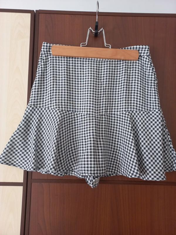 мини юбка с шортами на ультра-высокой посадке, со стороны застегиваются на замок, имеет боковые карманы. Длина 37 см, ПОТ 32 см, ПОБ 43 см.