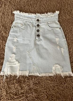 Юбка стан ідеальний, ніжно голубого відтінку з високою талією. Відомий бренд Розмір 26 (XS, S). джинс плотний Заміри: довжина - 42,5 см, пояс - 31.5см, бедра- 42 см.