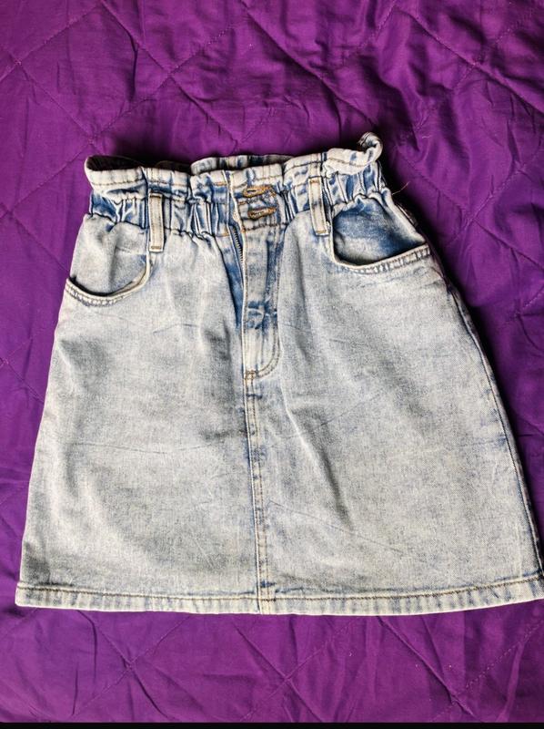 Джинсова спідниця до коліна для теплої погоди. Приємний світлий колір. Еластичний пояс, два ґудзики.