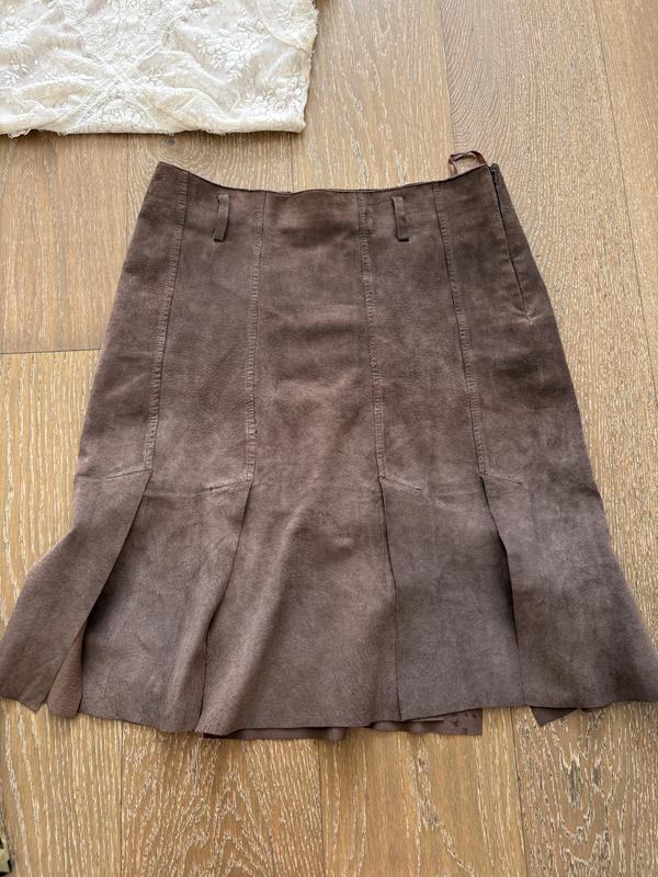 Спідниця шкіряна на підкладці та на замок збоку. Колір шоколадний. Цікавий крій Розмір M
