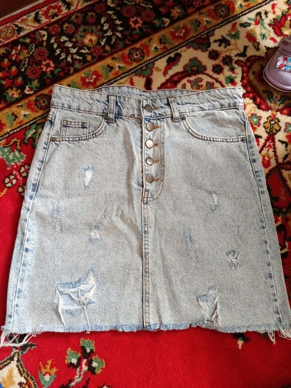 джинсова юбка без застежки, пять пуговиц полу объем талии 37 см полуобъем бедер 45 см длина юбки 42 см