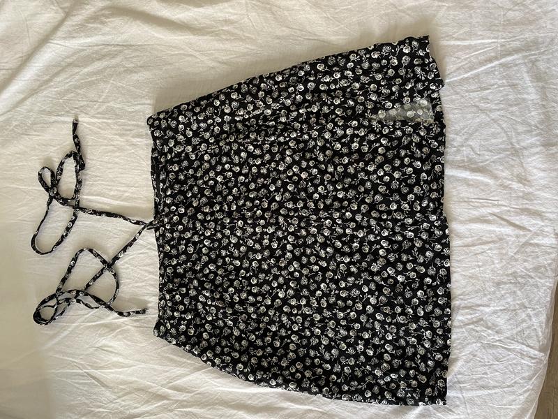 Міні спідниця з потаємною застібкою позаду, не величким розрізом спереду, також є поясок, який можна завʼязувати на талії, колір чорний, принтована білими трояндами