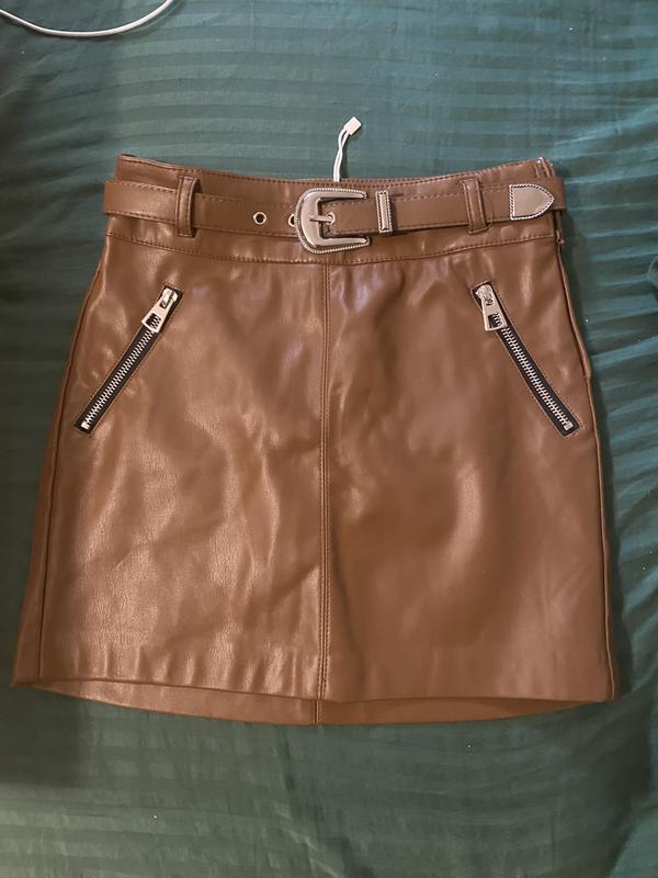 Искусственная кожа Размер XS Единый нюанс на поясе ( последнее фото ) Имитация карманов, ремень снимается, сбоку на молнии юбка Цвет присущую более темный Замеры: Полу обхват талии: 32 см Полу обхват бедер - 41 см Длина - 39 см