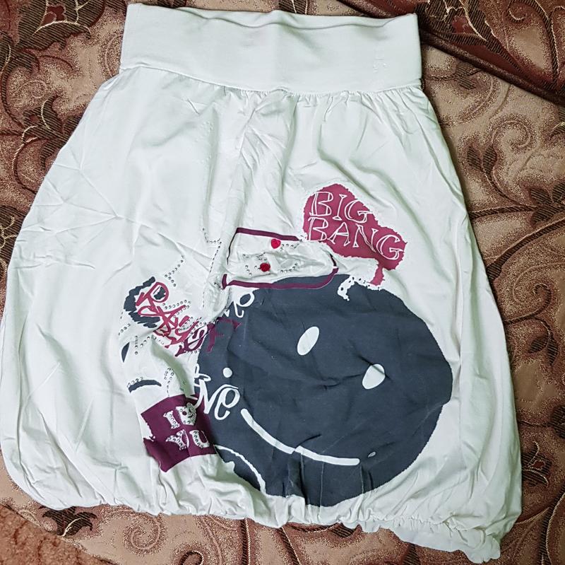 Стильная молодежная юбочка с положительным принтом Драпированный пышный подгиб формирует фасон "бочонок", который струнчит, красиво подчеркивает талию пояс на широкой резинке. Ткань - качественный хлопковый трикотаж. Производство - Турция ПОТ - 32 см ( норм тянется до 37), длина - 49 см