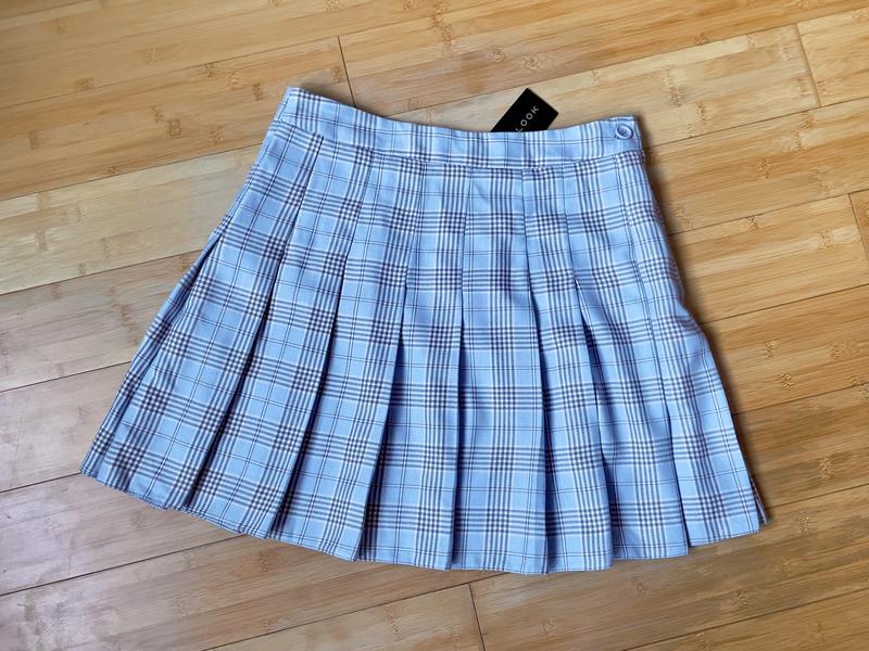 Тепла!спідниця-пліссе в клітинку,приємного,небесно-блакитного кольору,по типу фланелевої,не квола,приємна на дотик,добре тримає форму,відмінної якості та крою.Заміри дивіться на фото.