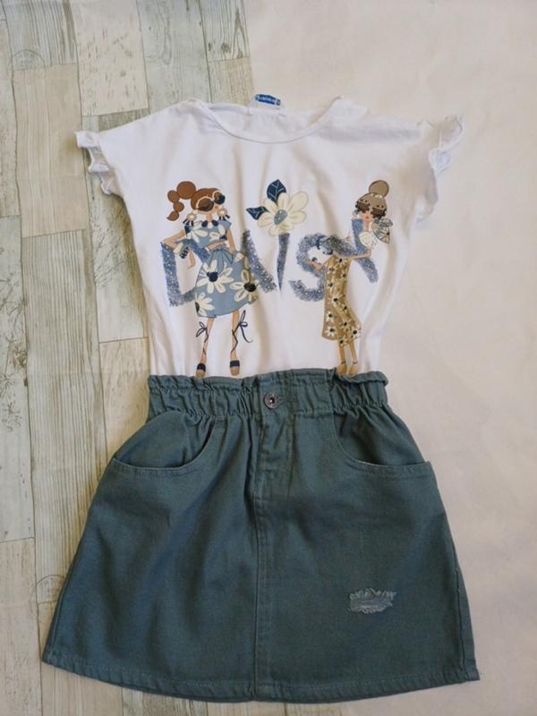 Отличный комплект на девочку 6_7 лет. Качественная хлопковая футболка с принтом девушек. И модная джинсовая юбка с потертостями. В новом состоянии. Надевали на выступ. Отлично подойдет в школу.