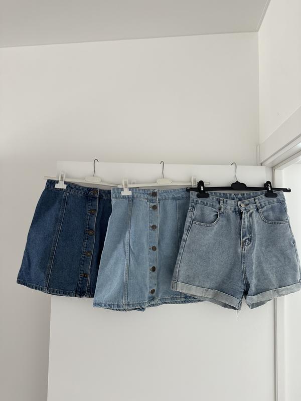 Спідниця в темному джинсі Розмір: 38 Ціна: 300 Спідниця в світлому джинсі Розмір: 28 Ціна: 300 грн Шорти Розмір: L ( краще підійде на M ) Ціна: 300 грн