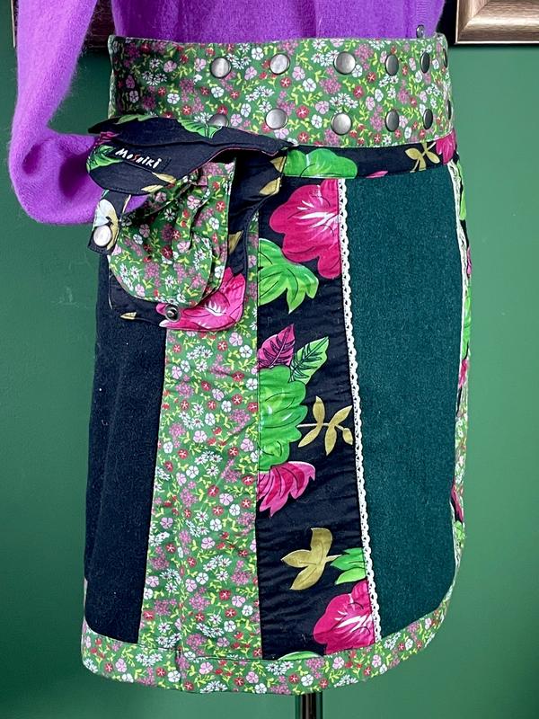 Спідниця на кнопках, яка регулюються по талії, тож сяде як на М так на L. На обидві сторони, є кишенька зємна