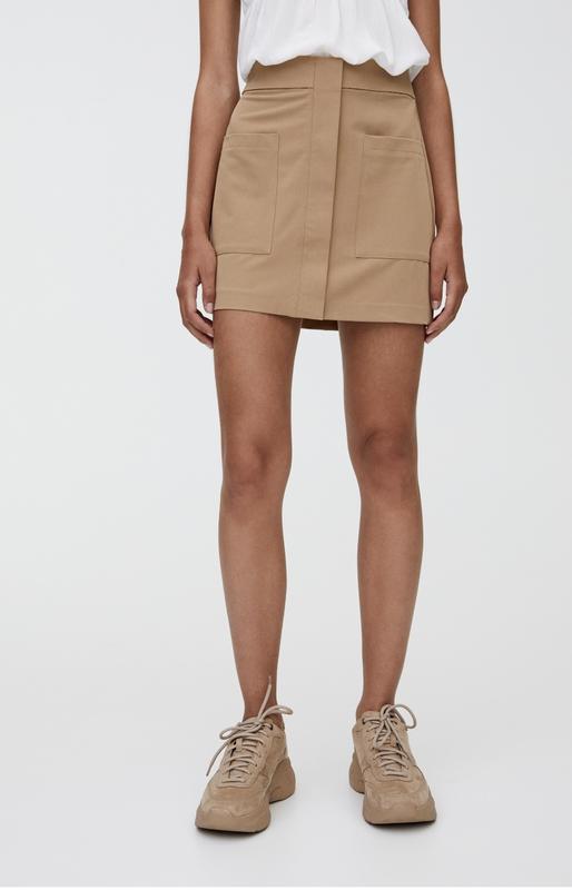Короткая юбка-трапеция с карманами спереди. Высокая посадка, сзади застежка потайная молния, спереди планка по длине.