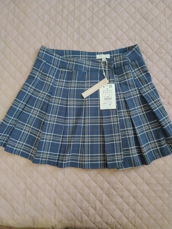 Юбка женская мини, в складку, темно - синяя в клетку, на запах, размер М. Замеры: длина 40 см, пояс 37 см.