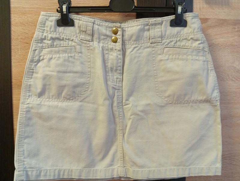 Джинсовая светлая мини юбка трапеция, состояние очень красивое, два кармана спереди, два сзади.