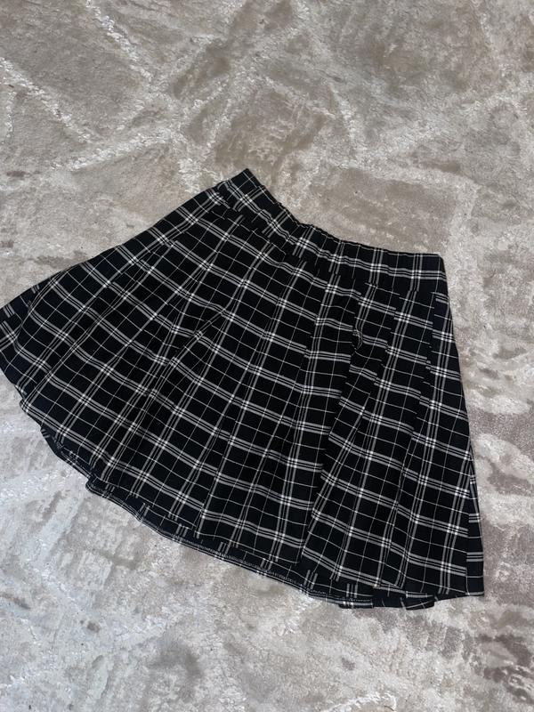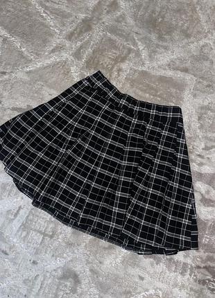 Тенісна спідниця Стан:ідеальний Розмір :S Тип ткани :текстиль Состав:% Полиэстер - 66%, Вискоза - 33%, Эластан - 1% Материал:подкладки, % без подкладки Утеплитель:без утеплителя Сезон:мульти Цвет:черный Узор:клетка Застежка:молния