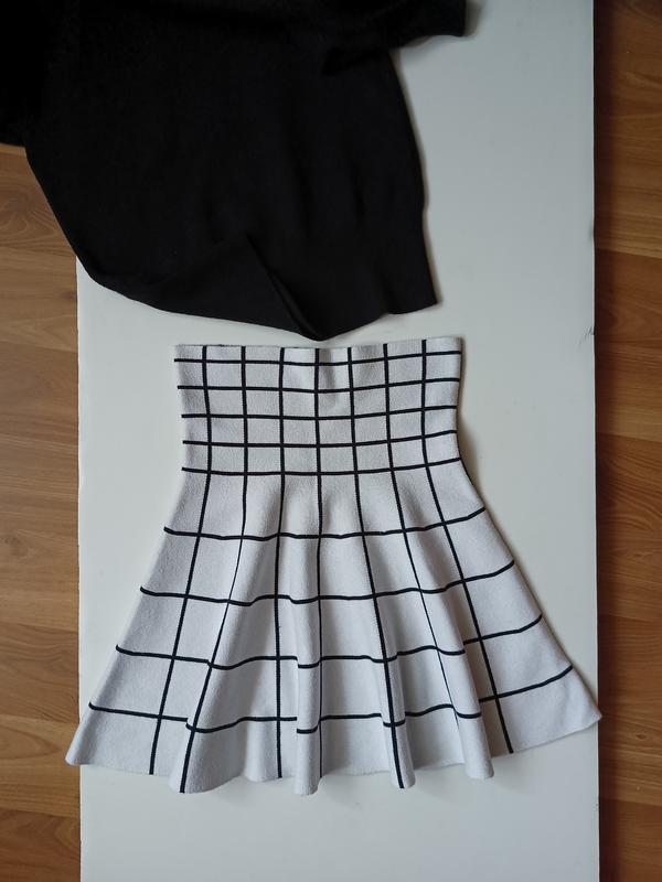 Очень классная юбочка клеш, белая в клетку. Верхняя треть облегает фигуру, акцентирует талию, далее расклешенная. Очень красивый состав трикотажа. Размер S (указано S/M), замеры на фото.