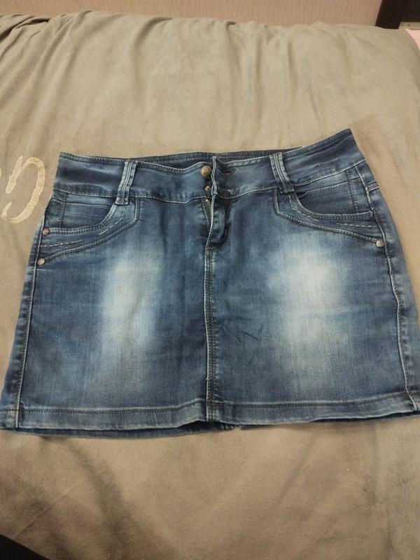 мини юбка джинсовая с эффектом потертостей, состояние очень хорошее, единственный недостаток, отсутствует одна пуговка, видна на фото