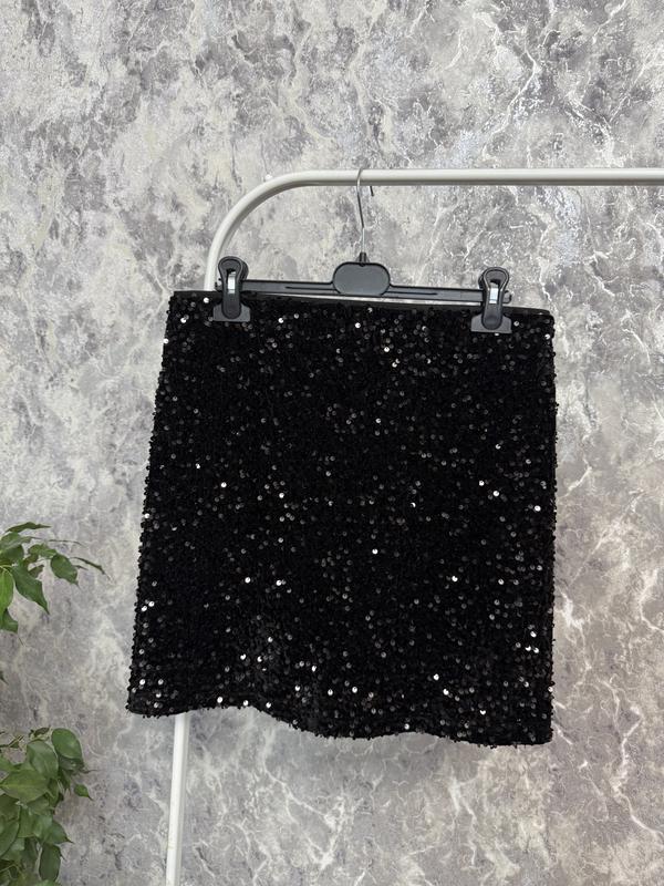 Трендова чорна міні спідниця в паєтку New look Паєтка на велюрі Розмір 12 Нова з біркою Довжина 44-45 ПОТ 38-48 ПОБ 48-56