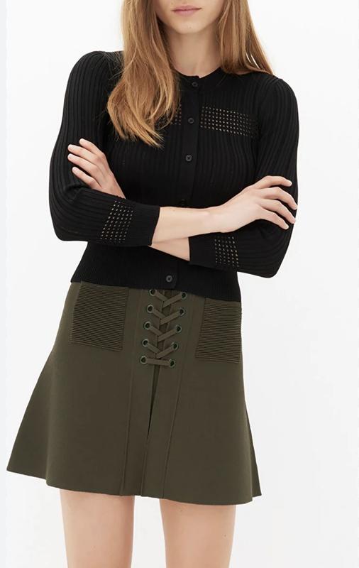 Міні спідниця з щільного трикотажу, колір зелений хакі (камера фокусується більше на коричневому, хоча в житті колір темно-зелений з коричневим підтоном). Бірка з розміром зрізана, підійде від XS-M, добре тягнеться. Довжина 41, пот 30/40, стегна 38/47, ширина по низу 52