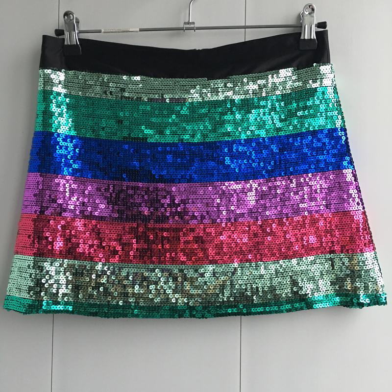 Дуже яскрава та святкова спідниця від Atmosphere Стан нової речі Спідниця на підкладці, не просвічує, тканина з паєтками тягнеться, але за рахунок підкладці усе добре сідає Усі паєтки на місці !! П/о талії 37 см П/о бедер 48 см (замір по підкладці) Ширина по низу 49 см Довжина 35 см