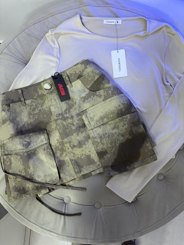 Спідниця в кольорі хакі від Misspap виконана зі щільної тканини, що добре тримає форму. Прямий крій із чіткою посадкою по талії. Дизайн доповнений накладними кишенями, що додають структурності. Розмір: L