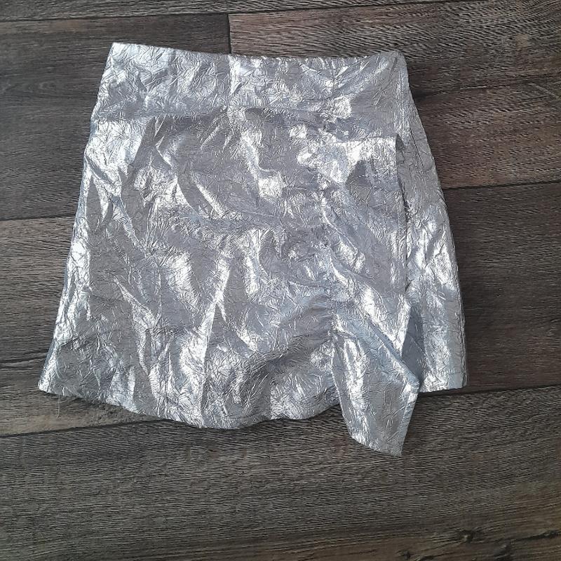 Юбка серебряного цвета с подкладкой на запахе, сбоку молния, сзади у пояса есть резинка. Замеры: Длина 33 см. талия в свободном положении 62 см. ПОБ 39 см.