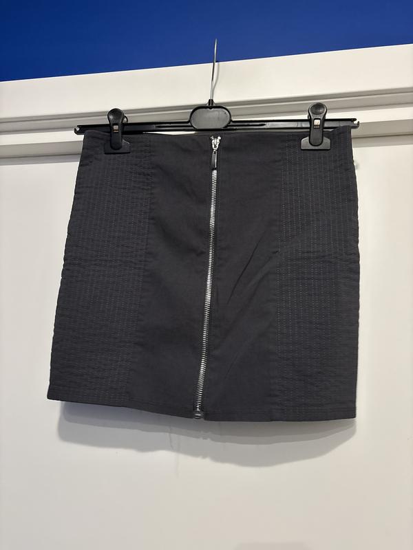 Коротка спідничка сірого кольору зі змійкою спереду від H&M. Еластична. Дуже гарно тягнеться. Розмір 40, краще на М
