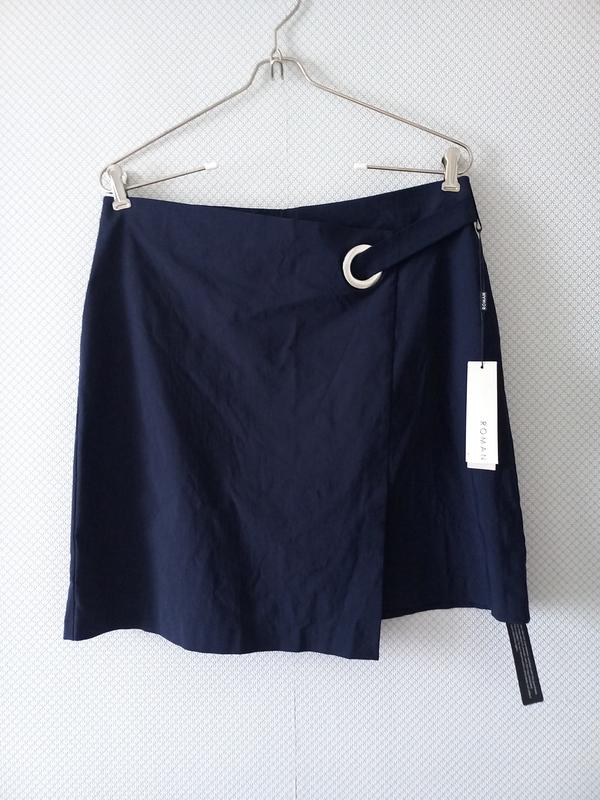 Юбка-трапеция темно-синего цвета с эффектом запаха. Без застежек, талия на резинке. Ткань с эластаном очень хорошо тянется. Бирка со составом срезанная. Новая, с этикеткой. Размер по набору 16. Замеры: талия - 42см, бедра - 53см, длина - 48см.