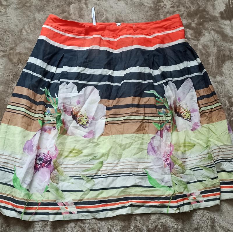 Легка літня спідниця, напівобхват талії 42см, довжина 59,5см, склад тканини 70%бавовна, 30%шовк, підкладка 100% поліестер, кольори не такі яскраві як на фото.