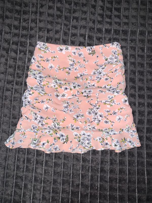 Жіноча спідниця міні з ніжним квітковим принтом у персиково-рожевих відтінках. Модель має еластичні вставки по боках, які створюють красивий рельєф та гарно підкреслюють фігуру. Тканина легка та приємна до тіла, спідниця виглядає дуже жіночно та стильно. Чудово підійде для літніх та повсякденних образів. Стан відмінний 🌸