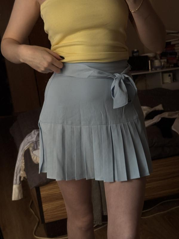 Спідниця-шорти з плісе Pamela x NA-KD Стильна та дуже жіночна спідниця-шорти ніжного блакитного кольору. Має високу посадку та пояс на запах із зав’язкою, що красиво підкреслює талію. Низ – акуратне плісе, всередині зручні шортики, тому комфортно носити навіть у вітряну погоду. Ідеально підійде як для прогулянок, так і для образів із підборами або кедами 🤍 📏 Розмір: XS–S (вказано 32) • Талія — 33 см • Стегна — 45 см • Довжина — 41 см Стан хороший. Легка, приємна до тіла тканина.
