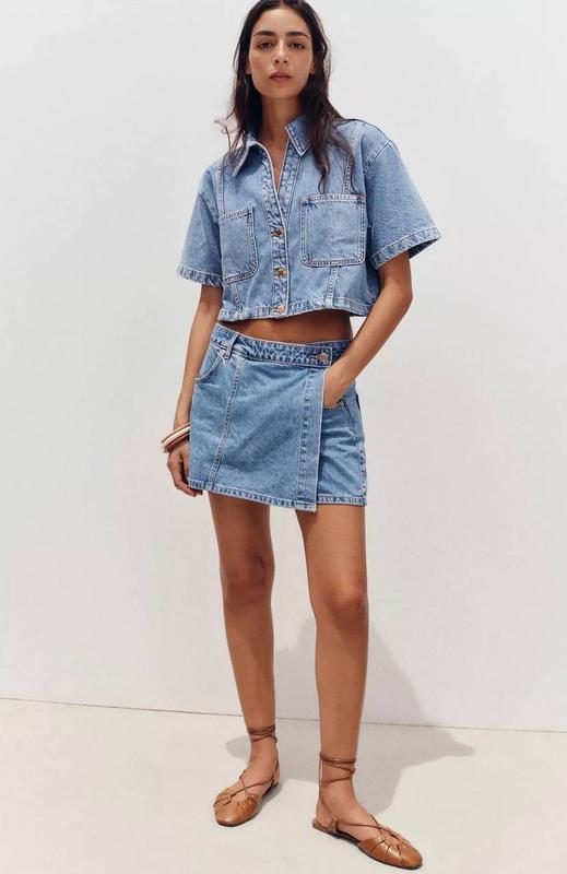 Спідниця-шорти з високою посадкою, кишенями спереду та накладними кишенями ззаду. Запах спереду з прихованою блискавкою та металевим Ґудзиком. СИНІЙ КОЛІР Розмір XS