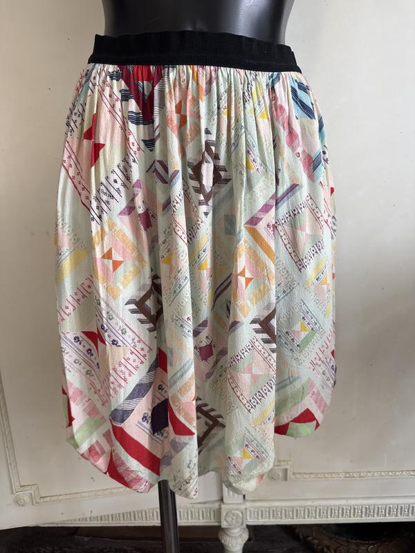 Склад:віскоза-100/. По талії широка гумка чорного кольору. Два кармани в бокових швах. Без підкладки. Розмір по бірці-36. Заміри: довжина-47 см, ПОТ-34 см, ПОБ-47 см. Стан ідеальний.