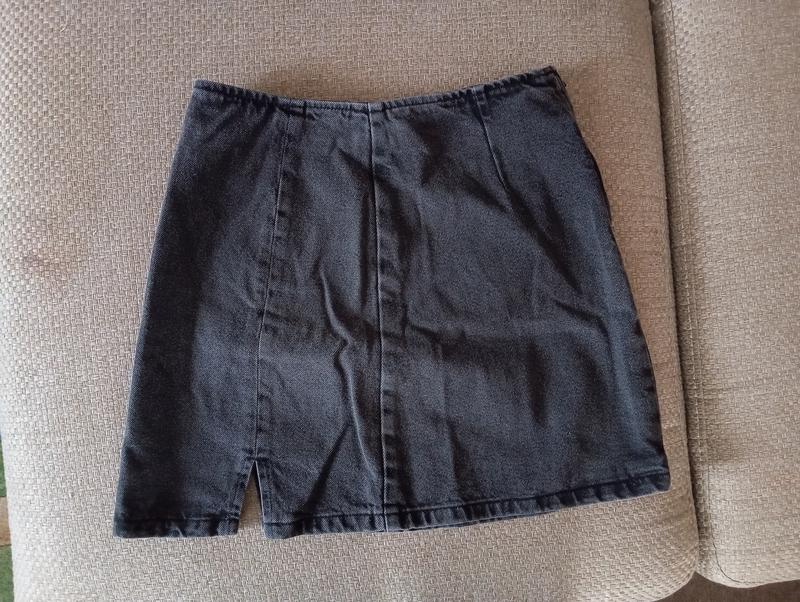 Мини юбка, джинс серый, пилотный. очень качественная. расчегивается со стороны. металлическая застежка. маленький разрез с одной стороны. S/XS