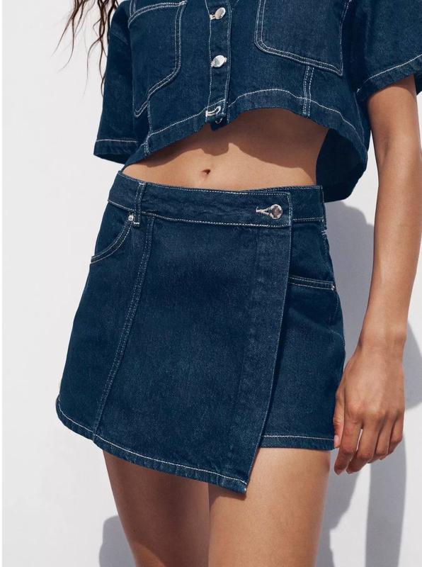 Спідниця-шорти з високою посадкою, кишенями спереду та накладними кишенями ззаду. Запах спереду з прихованою блискавкою та металевим ґудзиком.