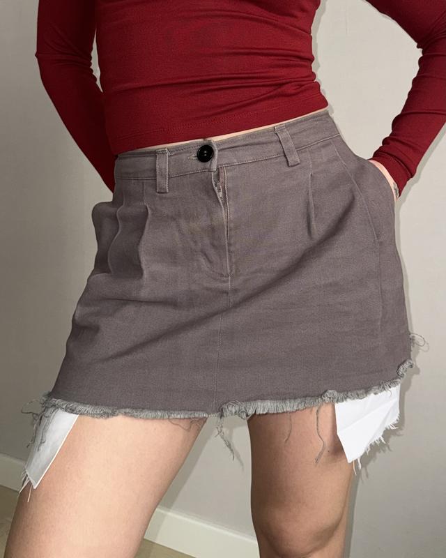 Міні спідниця с декором підкладу кишень. На блискавці та ґудзику . 100% котон, розмір С . Дуже стильна , классно сідає . Посадка може бути будь яка. Колір сіро-коричневий . Тягнеться.