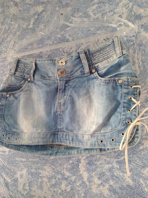 Короткая джинсовая юбка с завязками по бокам.