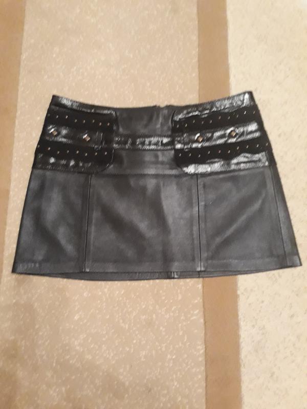 Кожаная коротенькая юбочка в отличном состоянии с кож.лаковыми и замшевыми вставками на подкладке.Ширина по бёдрам 45,длинна 30,размер xs