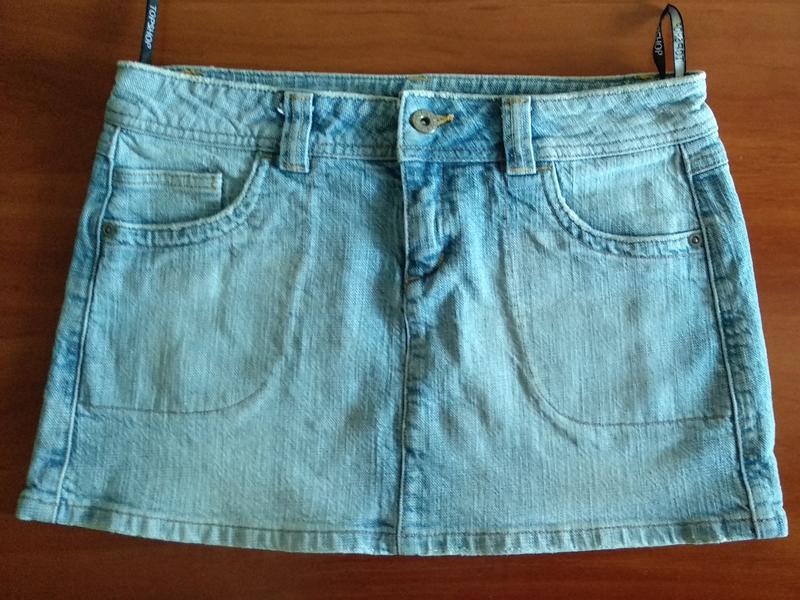 Мини юбка Topshop голубого цвета с элементами легкой потёртости, материал 98% хлопок, 2% лайкра. Длина 30 см, полуобхват бедер 47 см, полуобхват талии 37 см, объем внизу юбки 100 см.